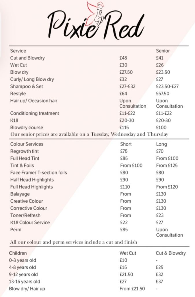 At Pixie Red we offer a wide range of hair treatments. Please check out our hair treatment price list below If you require any further information please contact us on 01582 363790